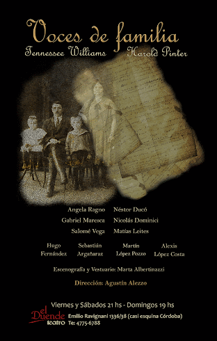 Espectáculo que reúne dos piezas relativamente breves, pertenecientes a dos dramaturgos que han tenido honda significación en el teatro del siglo XX: Tennessee Williams y Harold Pinter, “El largo adiós” y “Voces de familia”.